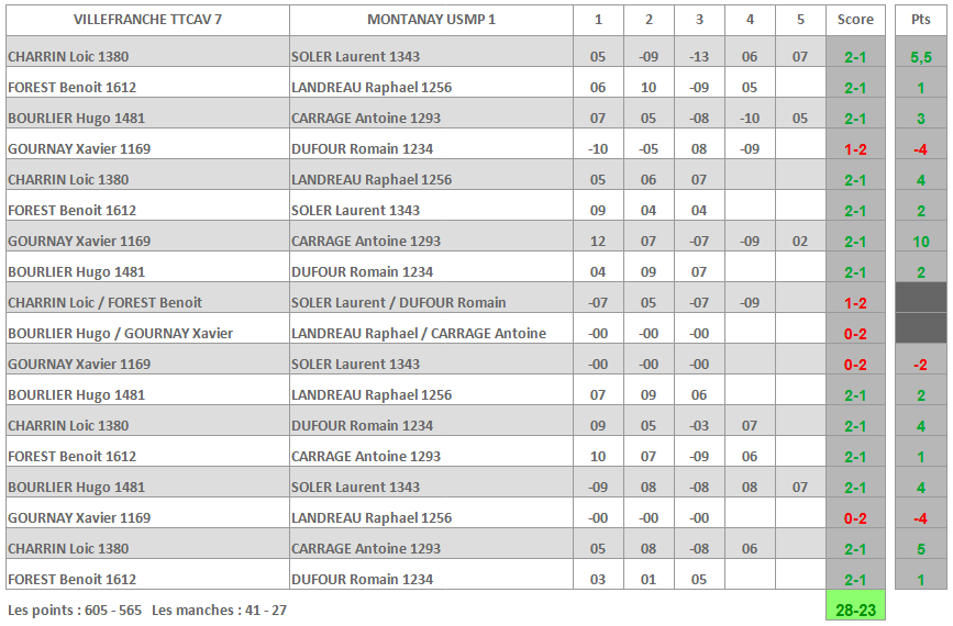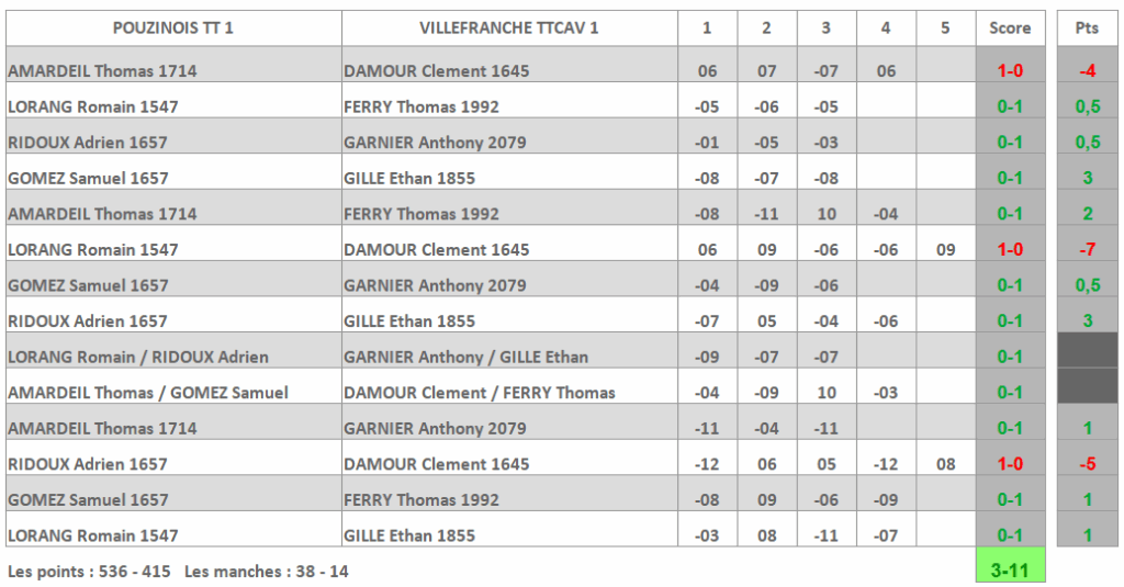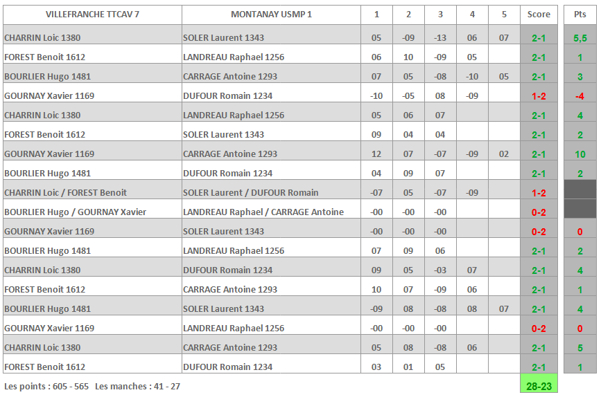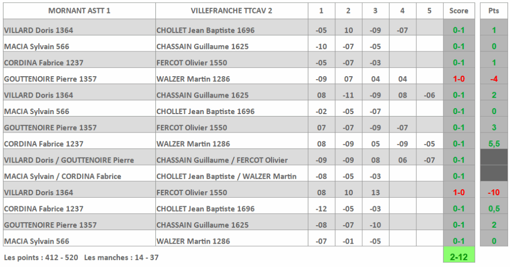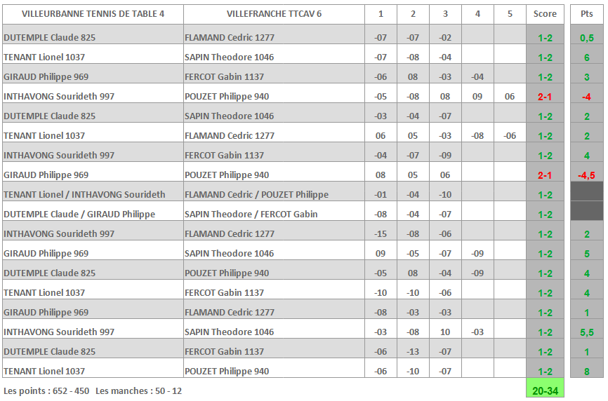 VILLEURBANNE TENNIS DE TABLE 4 VILLEFRANCHE TTCAV 6 DUTEMPLE Claude 825 FLAMAND Cedric 1277 TENANT Lionel 1037 SAPIN Theodore 1046 GIRAUD Philippe 969 FERCOT Gabin 1137 INTHAVONG Sourideth 997 POUZET Philippe 940 TOTAL POINTS EQUIPE : 3828 TOTAL POINTS EQUIPE : 4400