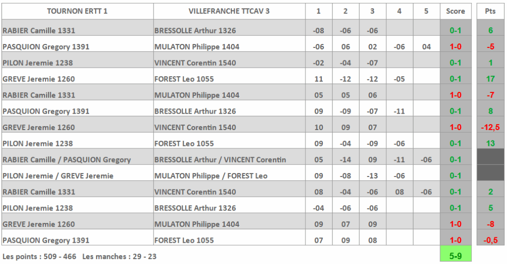 TOURNON ERTT 1 VILLEFRANCHE TTCAV 3 RABIER Camille 1331 BRESSOLLE Arthur 1326 PASQUION Gregory 1391 MULATON Philippe 1404 PILON Jeremie 1238 VINCENT Corentin 1540 GREVE Jeremie 1260 FOREST Leo 1055 TOTAL POINTS EQUIPE : 5220 TOTAL POINTS EQUIPE : 5325