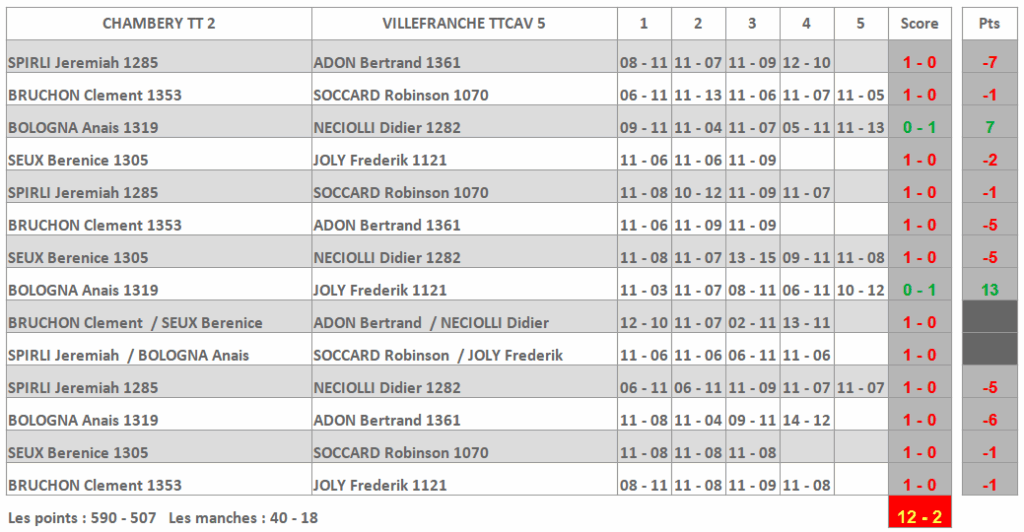 CHAMBERY TT 2 VILLEFRANCHE TTCAV 5 SPIRLI Jeremiah 1285 ADON Bertrand 1361 BRUCHON Clement 1353 SOCCARD Robinson 1070 BOLOGNA Anais 1319 NECIOLLI Didier 1282 SEUX Berenice 1305 JOLY Frederik 1121 TOTAL POINTS EQUIPE : 5262 TOTAL POINTS EQUIPE : 4834