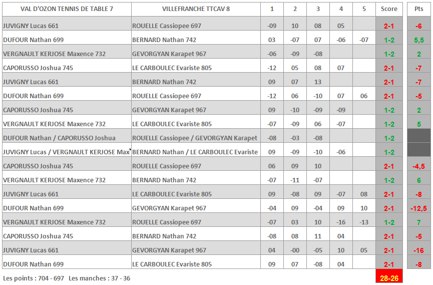VAL D’OZON TENNIS DE TABLE 7 VILLEFRANCHE TTCAV 8 JUVIGNY Lucas 661 ROUELLE Cassiopee 697 DUFOUR Nathan 699 BERNARD Nathan 742 VERGNAULT KERJOSE Maxence 732 GEVORGYAN Karapet 967 CAPORUSSO Joshua 745 LE CARBOULEC Evariste 805 TOTAL POINTS EQUIPE : 2837 TOTAL POINTS EQUIPE : 3211