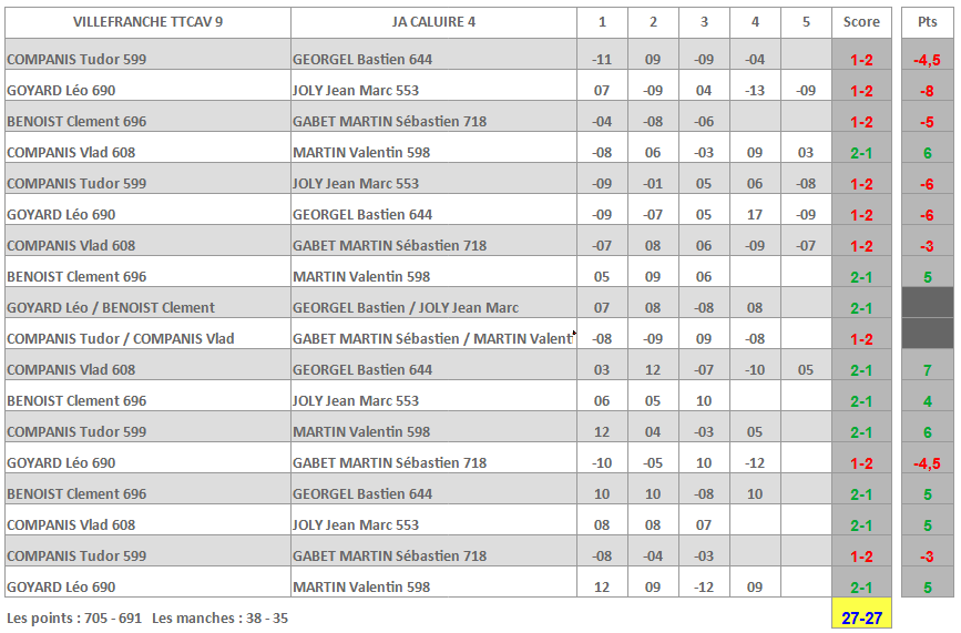 VILLEFRANCHE TTCAV 9 JA CALUIRE 4 COMPANIS Tudor 599 GEORGEL Bastien 644 GOYARD Léo 690 JOLY Jean Marc 553 BENOIST Clement 696 GABET MARTIN Sébastien 718 COMPANIS Vlad 608 MARTIN Valentin 598 TOTAL POINTS EQUIPE : 2593 TOTAL POINTS EQUIPE : 2513