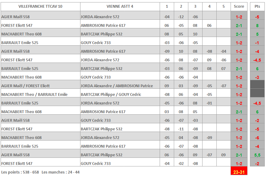 VILLEFRANCHE TTCAV 10 VIENNE ASTT 4 AGIER Maël 558 JORDA Alexandre 572 FOREST Eliott 547 AMBROSIONI Patrice 617 MACHABERT Theo 608 BARTCZAK Philippe 532 BARRAULT Emile 525 GOUY Cedric 733 TOTAL POINTS EQUIPE : 2238 TOTAL POINTS EQUIPE : 2454