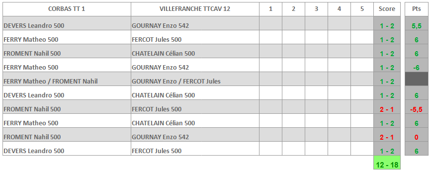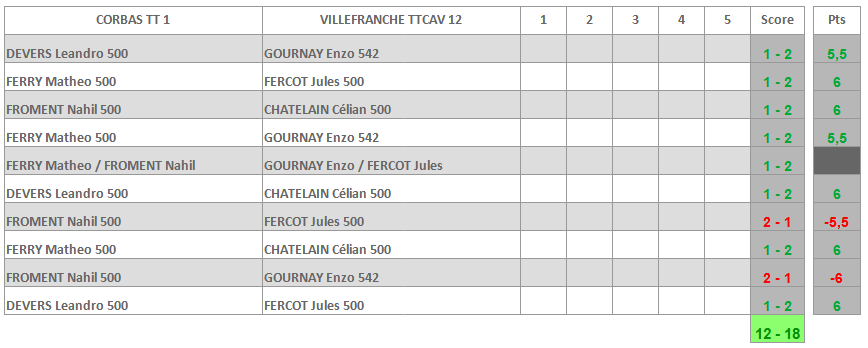 CORBAS TT 1 VILLEFRANCHE TTCAV 12 DEVERS Leandro 500 GOURNAY Enzo 542 FERRY Matheo 500 FERCOT Jules 500 FROMENT Nahil 500 CHATELAIN Célian 500 TOTAL POINTS EQUIPE : 1500 TOTAL POINTS EQUIPE : 1542