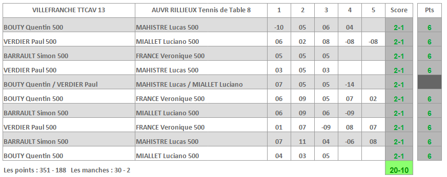 VILLEFRANCHE TTCAV 13 AUVR RILLIEUX Tennis de Table 8 BOUTY Quentin 500 MAHISTRE Lucas 500 VERDIER Paul 500 MIALLET Luciano 500 BARRAULT Simon 500 FRANCE Veronique 500 TOTAL POINTS EQUIPE : 1500 TOTAL POINTS EQUIPE : 1500