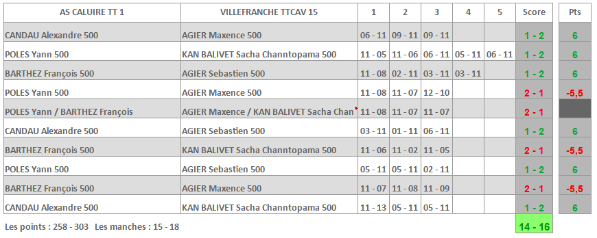 AS CALUIRE TT 1 VILLEFRANCHE TTCAV 15 CANDAU Alexandre 500 AGIER Maxence 500 POLES Yann 500 KAN BALIVET Sacha Channtopama 500 BARTHEZ François 500 AGIER Sebastien 500 TOTAL POINTS EQUIPE : 1500 TOTAL POINTS EQUIPE : 1500
