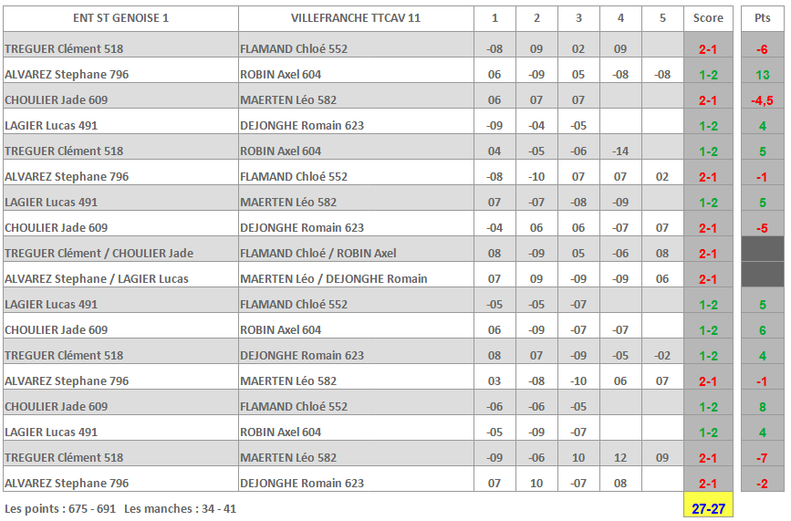 ENT ST GENOISE 1 VILLEFRANCHE TTCAV 11 TREGUER Clément 518 FLAMAND Chloé 552 ALVAREZ Stephane 796 ROBIN Axel 604 CHOULIER Jade 609 MAERTEN Léo 582 LAGIER Lucas 491 DEJONGHE Romain 623 TOTAL POINTS EQUIPE : 2414 TOTAL POINTS EQUIPE : 2361