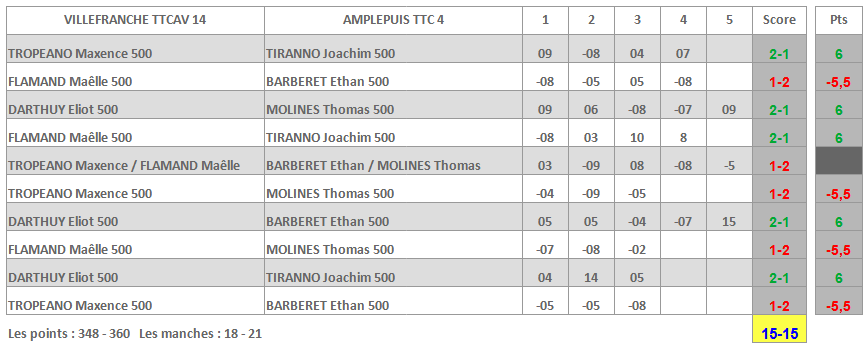 VILLEFRANCHE TTCAV 14 AMPLEPUIS TTC 4 TROPEANO Maxence 500 TIRANNO Joachim 500 FLAMAND Maêlle 500 BARBERET Ethan 500 DARTHUY Eliot 500 MOLINES Thomas 500 TOTAL POINTS EQUIPE : 1500 TOTAL POINTS EQUIPE : 1500