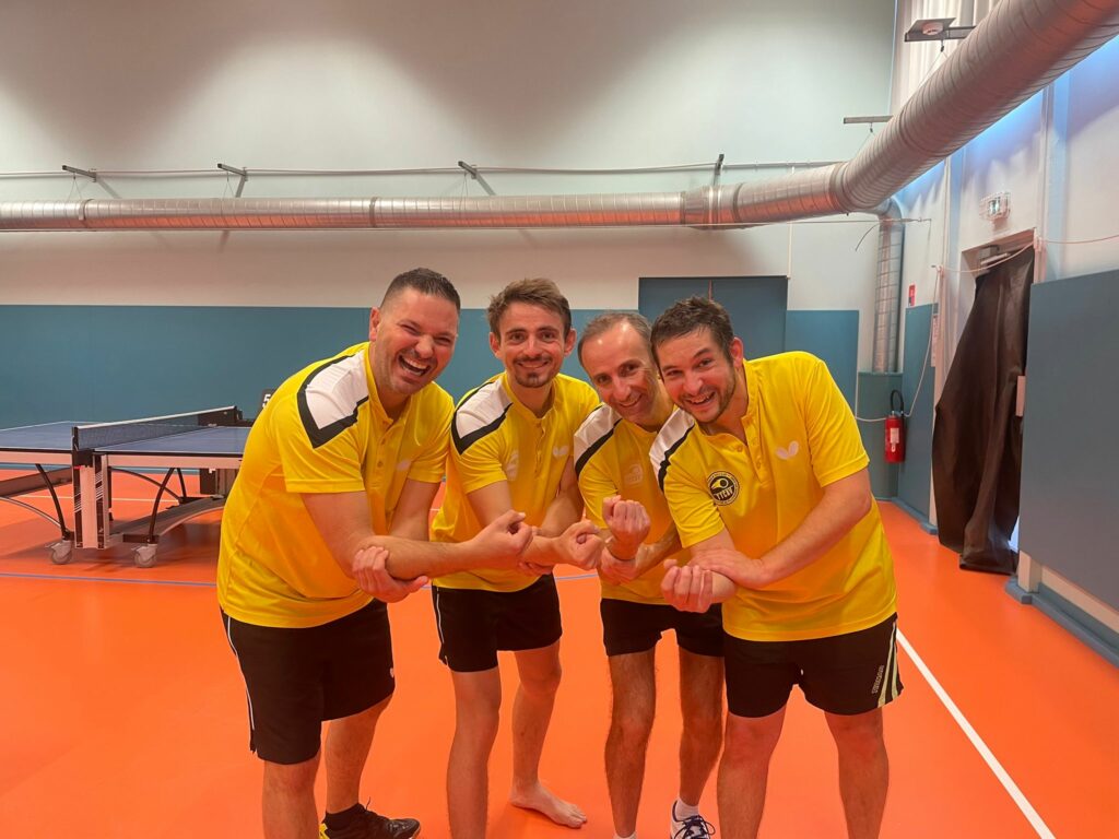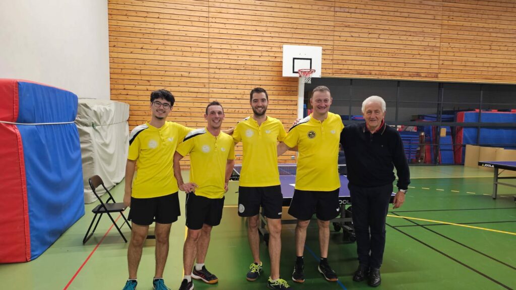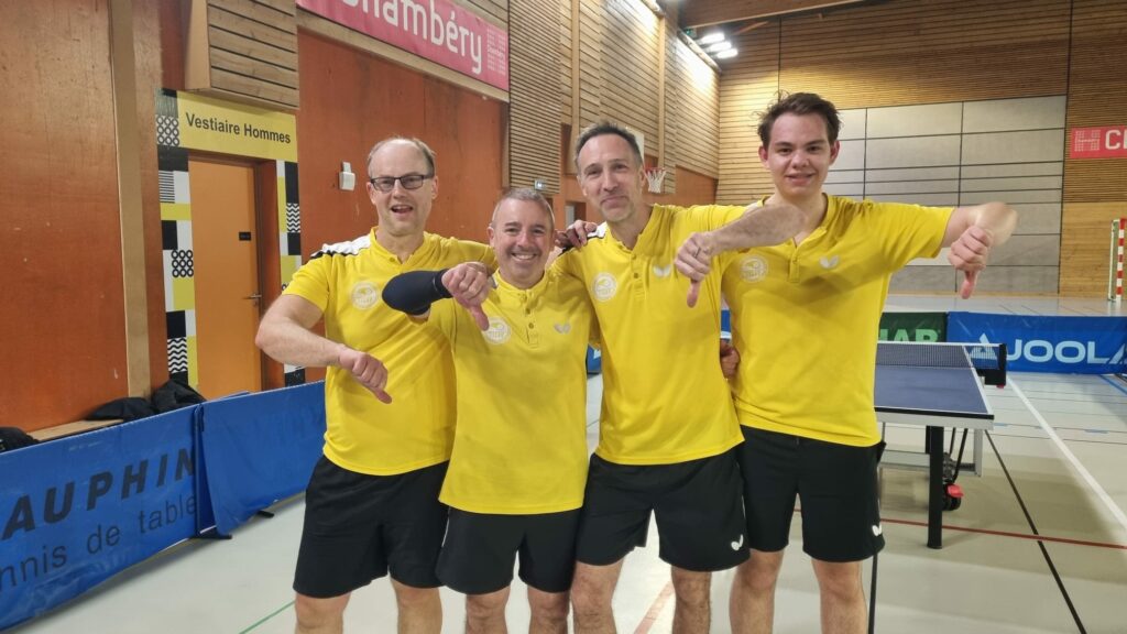 Raphaël, Fabien, Pierre et Jacques conservent le sourire malgré une défaite qui les place dans la zone de relégation . Un grand merci à Bernard le supporter de toujours !