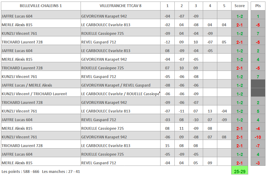 Nous noterons le nouveau sans faute de Jean Baptiste CHOLLET, les deux points de Guillaume CHASSAIN et de Corentin VINCENT, et le point précieux rapporté une nouvelle fois par Olivier FERCOT. Les deux paires caladoises se sont également imposées en double comme évoqué plus haut.