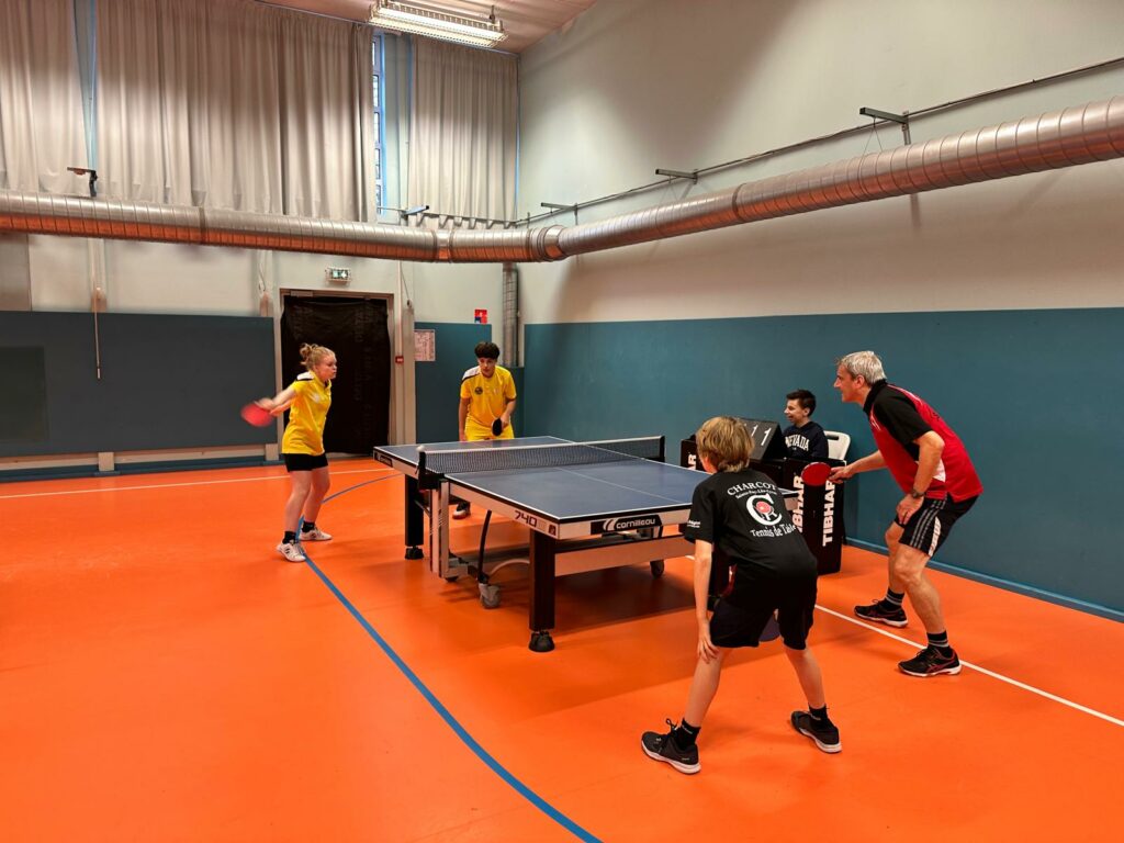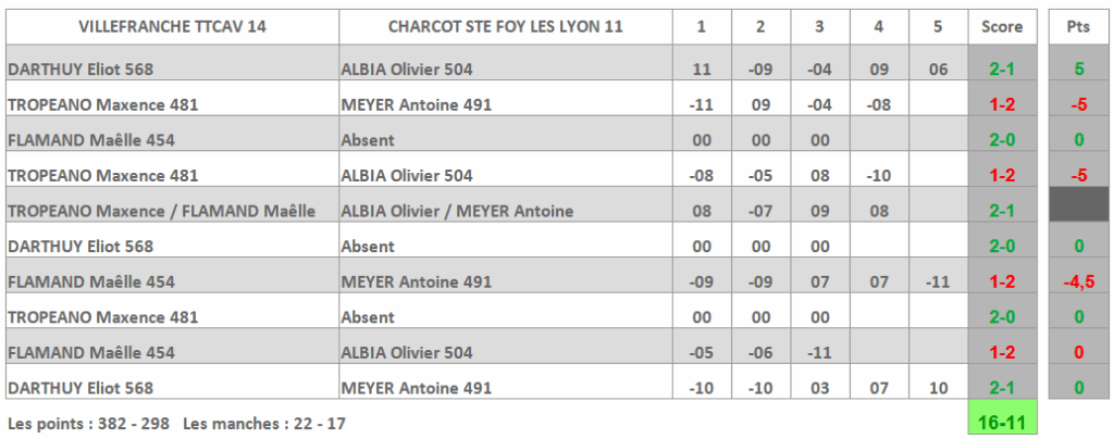 Les Caladois empochent les 3 points de la victoire bien aidés en cela par l’absence d’un joueur dans les rangs adverses. Sur les 7 parties réellement disputées, 3 seront arrachées par les jaunes et notamment Eliot DARTHUY par deux fois en simple et par Maxence TROPEANO avec Maêlle FLAMAND en double, alors que la paire de Charcot engrange 4 victoires. Les 3 victoires sur forfait ont donc fait un bien fou aux Caladois 😉