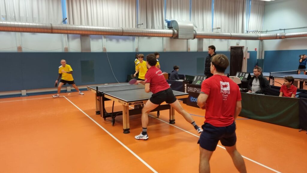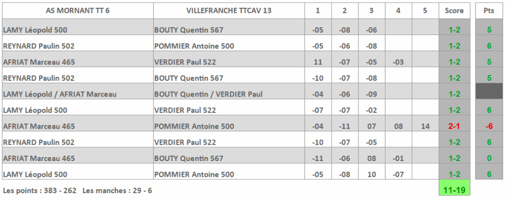 Très large succès à mettre à l’actif de l’équipe 13 qui s’est imposée au détriment d’une équipe de Mornant qui a réussi toutefois à sauver l’honneur au bout d’une partie où le suspense fut au rendez-vous (16-14 dans la manche décisive !). Paul VERDIER fait un sans faute en simple mais s’incline en double en compagnie de Quentin BOUTY. Quentin fait aussi 3 en simples tandis qu’Antoine fut contraint d’abandonner un point à l’un de ses adversaires.