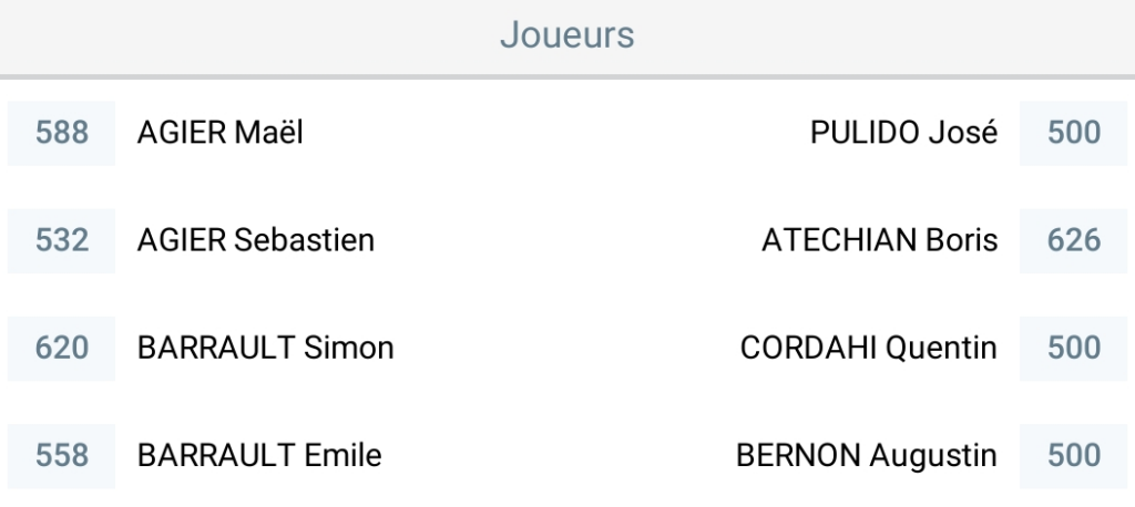| 1 | BOURLIER Hugo 1447 | vs | FOURNOT Fabien 1775 | +328 |