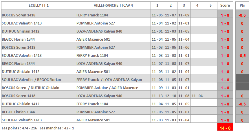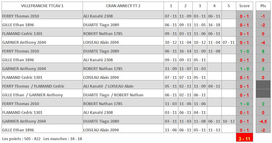 Il n’y a pas eu de miracle, Cran Annecy c’est vraiment du très très costaud, et même si Antho et consorts ont crânement joué leur chance, il y avait un cran (forcément) d’écart entre les 2 équipes. Les Caladois avec un peu plus de réussite auraient pu rapporter un point supplémentaire par l’entremise d’Anthony GARNIER qui s’incline dans la manche décisive aux avantages. Thomas FERRY, étincelant, aura été le caladois le plus en vue. Ethan GILLE et Cédric FLAMAND ont fait le maximum mais sur ce coup, ce n’aura pas été suffisant.