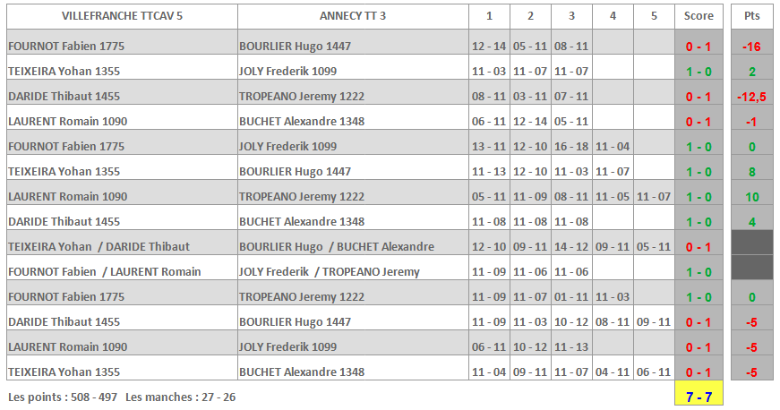 L’équipe 5 en déplacement à Annecy, réalise une très bonne opération en rapportant les 2 points du nul. Une belle performance quand on y regarde de plus près car l’équipe d’Annecy comptait dans ses rangs un 17 et partait avec un net avantage. Mais c’était compter sans un Hugo BOURLIER, auteur donc de la perf du jour et d’une victoire sur un 14. Espérons que ce niveau de performance lui apporte le regain de mental qui lui a peut être fait défaut ces derniers temps. Alexandre BUCHET de retour aux affaires, a soigné son come back en remportant 2 points en simple et le double en compagnie d’Hugo. Rayon Perfs, Jérémy TROPEANO y est allé aussi de sa poche en prenant le meilleur en 3 sets sur un 14 !!! Frederik JOLY a trouvé les ressources en fin de partie avec ses coéquipiers pour raccrocher les wagons alors que le succès semblait en bonne voie pour les joueurs savoyards.