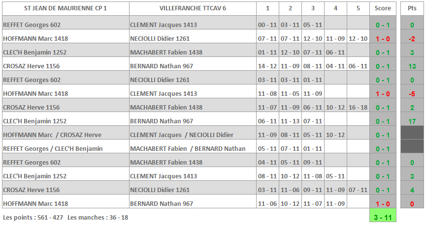 L’équipe 6 a parfaitement négocié son début de phase en remportant, avec la manière, ce premier duel qui l’opposait à Saint Jean de Maurienne. Seul le meilleur joueur adverse, Marc HOFFMAN, est parvenu à contrarier les joueurs du TTCAV puisqu’il s’impose dans ses 3 simples. Toutes les autres parties ont basculé côté ttcavistes. Malgré l’ampleur du score, certaines parties ont été particulièrement disputées, à l’image de cette première partie perdue par Didier NECIOLLI alors qu’il menait 2 manches à 0 et a vu son adversaire revenir progressivement à sa hauteur pour finir par le dépasser sur le fil (photo finish à l’appui) 12-10 dans la manche décisive. Quelques regrets donc mais aussi une très belle satisfaction de voir d’une part nos 3 tauliers, Didier NECIOLLI, Jacques CLEMENT et Fabien MACHABERT gagner, et d’autre part de voir la confirmation des immenses progrès accomplis par Nathan BERNARD qui perfe contre un 11 et contre un 12 !